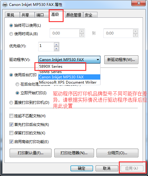 进入打印机属性后切换到高级页面,选择打印机驱动程序后点击应用