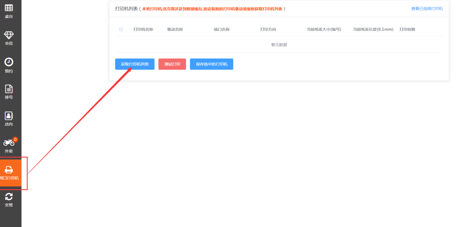 4.打印机安装完成之后,打开PC收银端,通过左侧栏找到网口打印机设置,并获取打印机列表