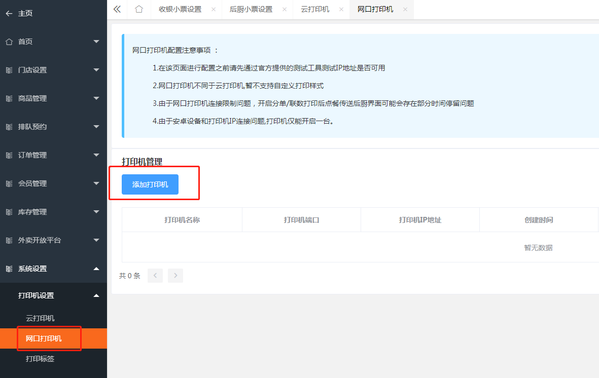 4、目前网口打印机仅支持奶茶店以及餐饮店,快餐店类型pc端不支持打印