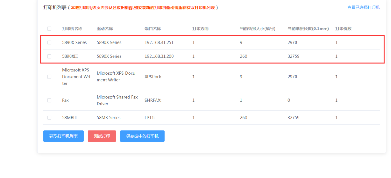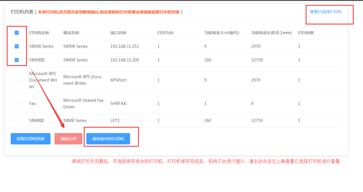 获取到的打印机列表信息为电脑上已存在的打印机,将会检测出刚才安装的两台打印机信息,可勾选安装的打印机并点击测试打印,查看是否有打印信息