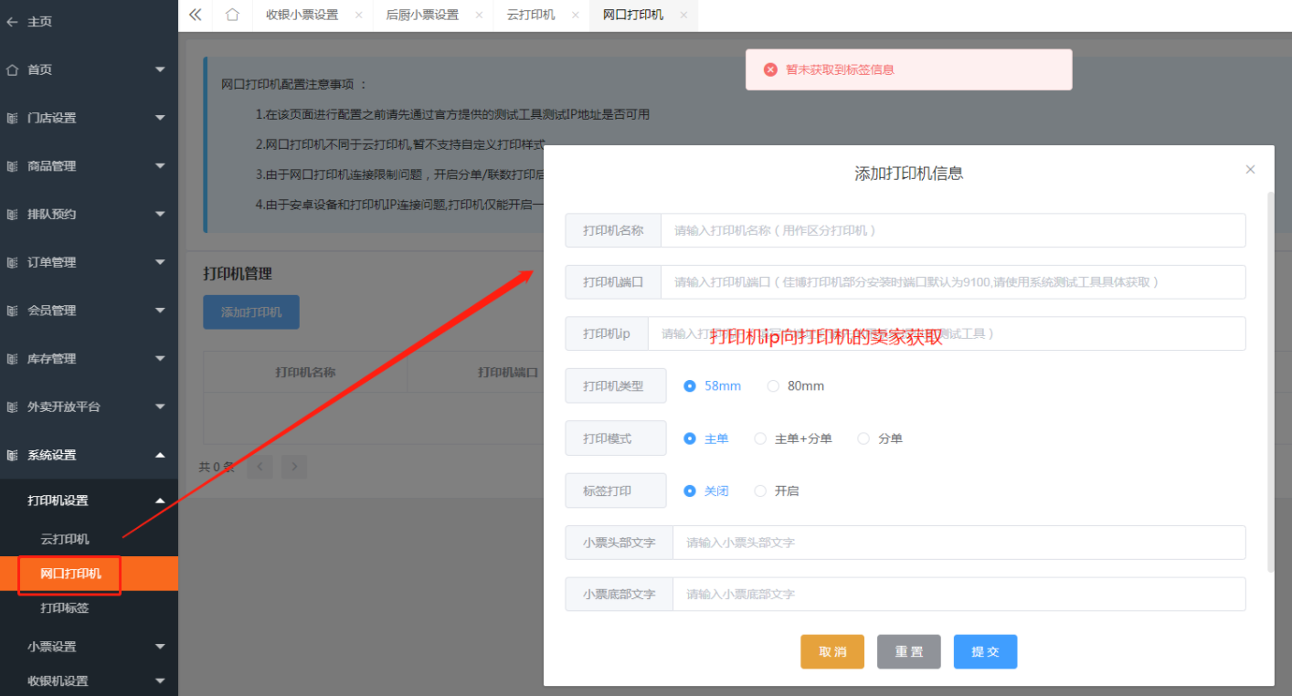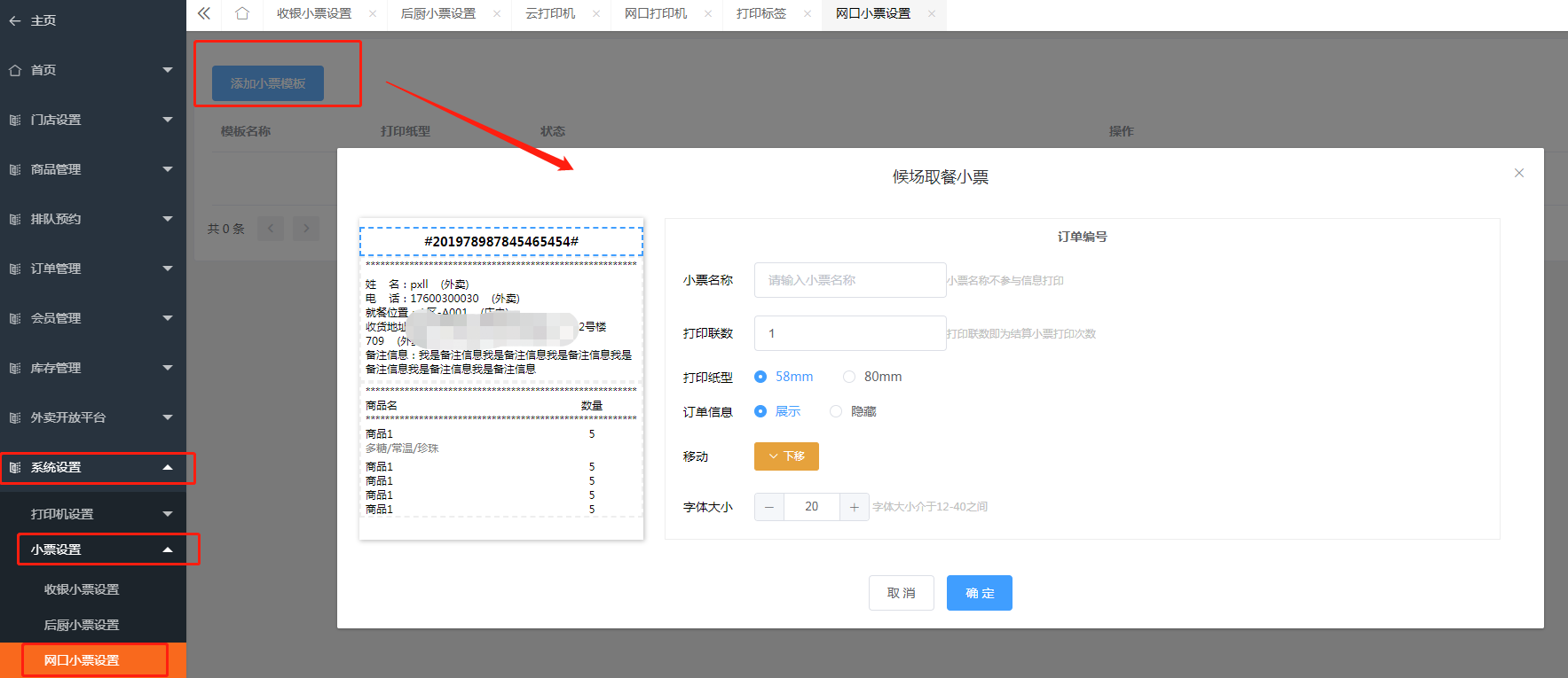 1、进入门店后台,点击网口小票设置,添加网口打印机的小票样式