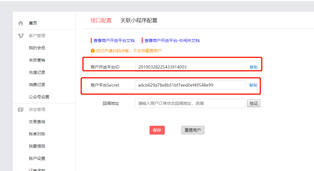 复制商户开放平台ID和商户平台Secret到我们后台对应的地方