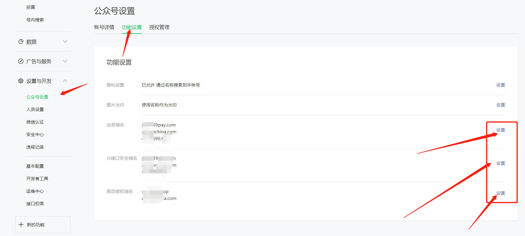 4.点公众号设置——公众设置(业务域名、JS接口安全域名、网页授权域名分别设置自己后台的登陆域名,域名:all.vjmchina.com)