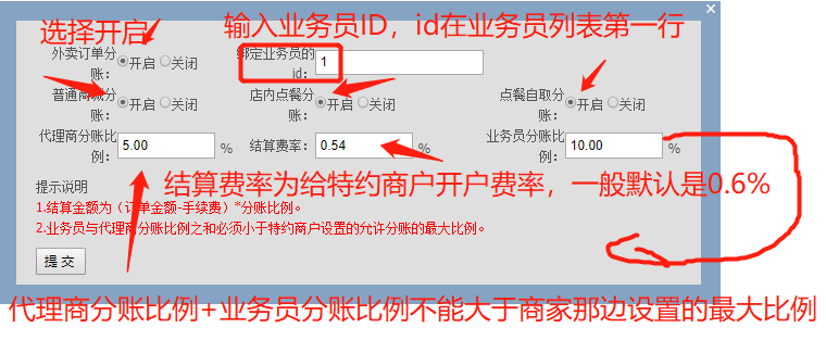 3.代理商分账比例+业务员的分账比例小于等于给商户设置的最高比例