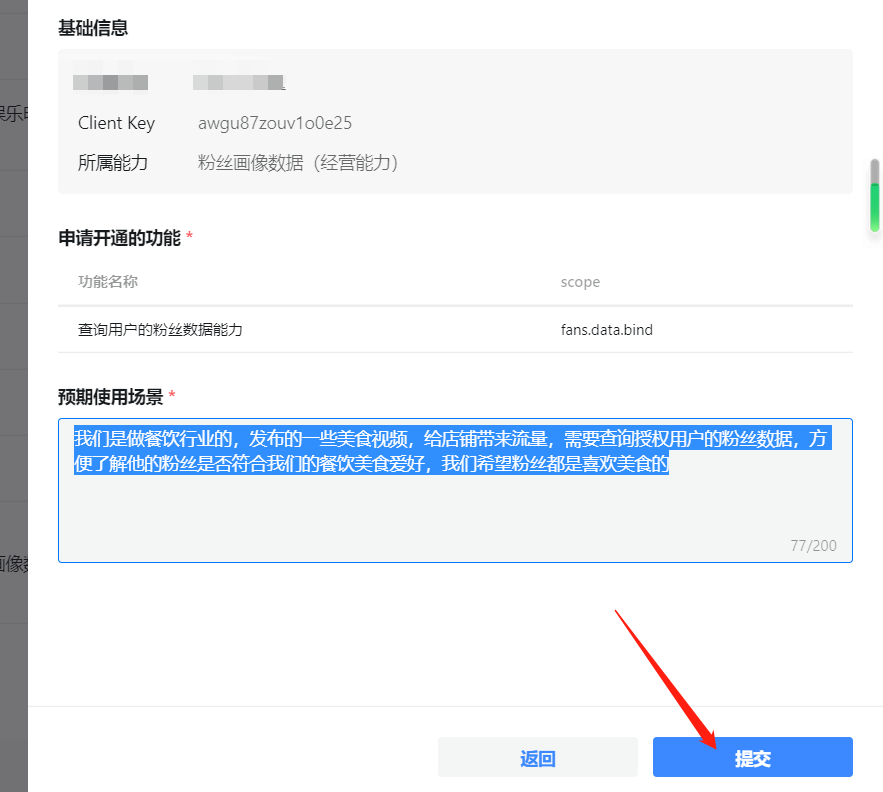 申请理由:我们是做餐饮行业的,发布的一些美食视频,给店铺带来流量,需要查询授权用户的粉丝数据,方便了解他的粉丝是否符合我们的餐饮美食爱好,我们希望粉丝都是喜欢美食的