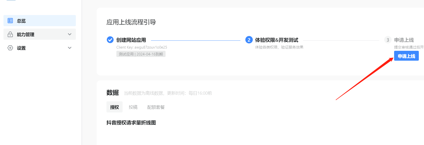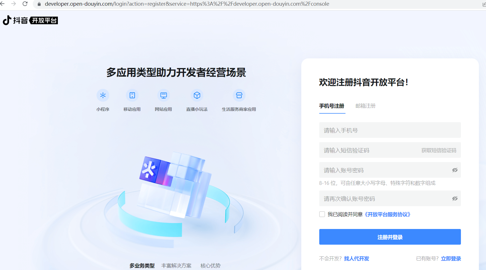 第一:抖音开发平台申请条件 1. 必须是正规的企业,有营业执照 2. 企业要有正规的官方网站(且网站域名备案要和企业信息一致)3.要有站点回调域名(该域名必须备案,但不强制要和公司主体信息一致)也就是客户扫码之后的回调链接。 第二:申请开发平台账号,注册抖音开放平台帐号(https://developer.open-douyin.com/)1. 一定要有官网,并且保证能正常访问 2. 营业执照一定要真实,并且保证没有过期 3. 官网上的产品介绍要和营业执照经营范围相关 第三:抖音开发平台申请 1. 完成开发平台账号认证,可选普通用户、企业用户、行业/企业服务商。2. 通常选择普通用户即可,审核周期一般 1-3 天。