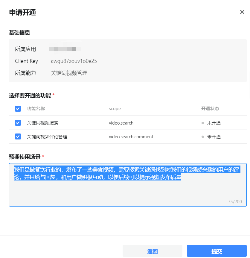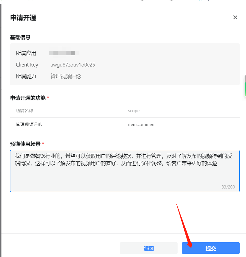 申请理由:我们是做餐饮行业的,希望可以获取用户的评论数据,并进行管理,及时了解发布的视频得到的反馈情况,这样可以了解发布的视频用户的喜好,从而进行优化调整,给客户带来更好的体验