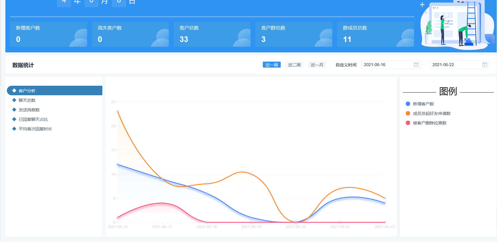 概况总览可统计所有员工的客户,新增的数量,流失的数量等等一个统计信息