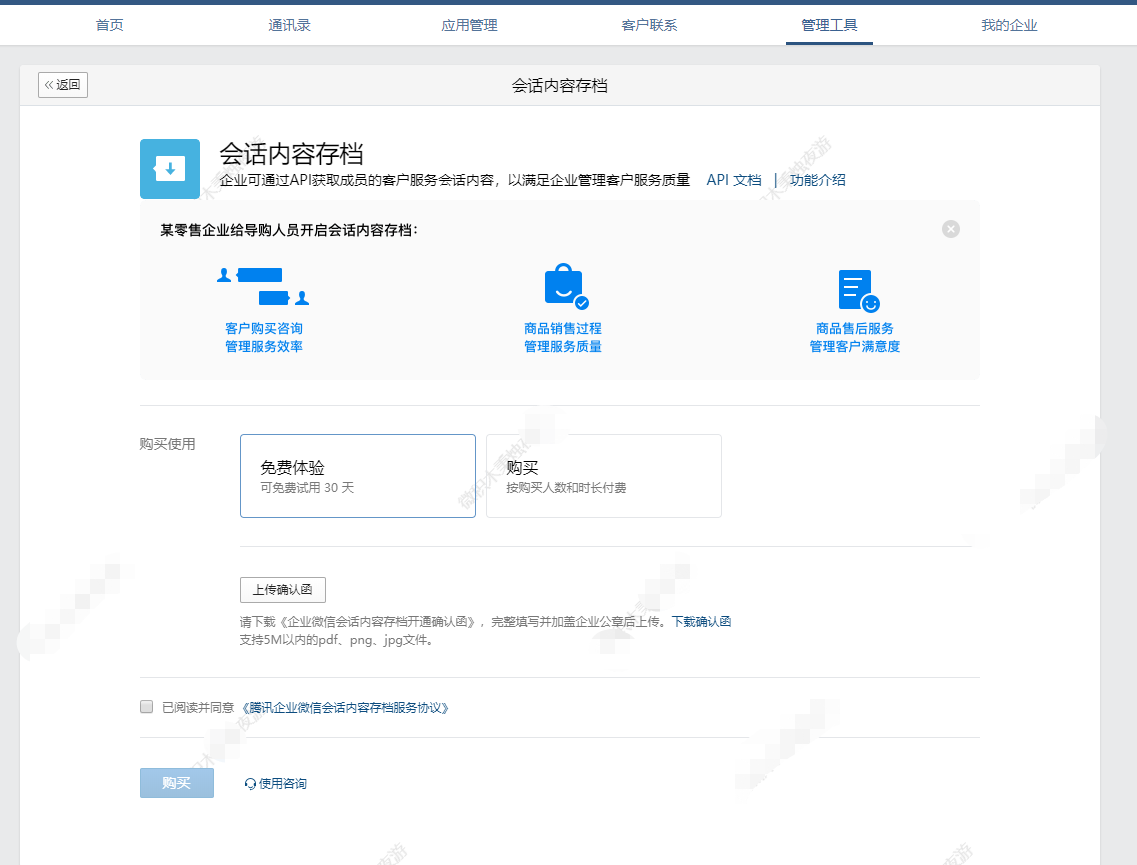 1.需要客户同意,如果不同意存档择不保存聊天数据,每使用一个员工需要支付给腾讯300元,酌情使用