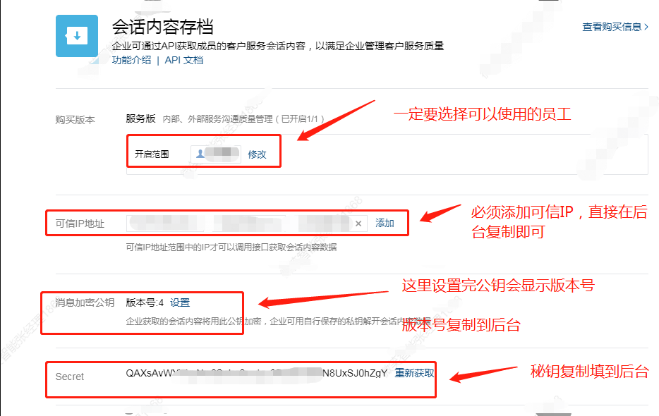 一、登录企业微信后台开通会话存档功能 一般的客户建议选择服务版,如果是自己测试可以先提交相关资料试用1个月;