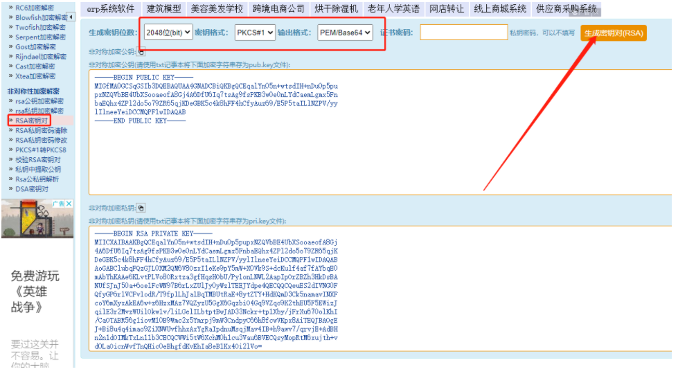 密钥生成地址:[http://web.chacuo.net/netrsakeypair](https://support.qq.com/products/174823/link-jump?jump=http%3A%2F%2Fweb.chacuo.net%2Fnetrsakeypair)