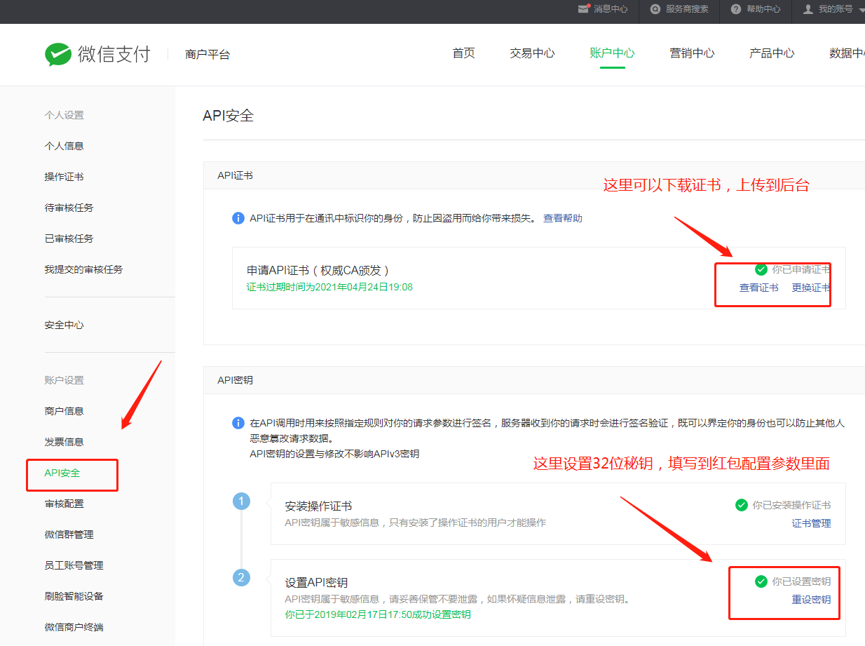 2.API秘钥为自己在微信支付后台配置的32位密钥,点击右上角商户号,之后按下图所示操作即可