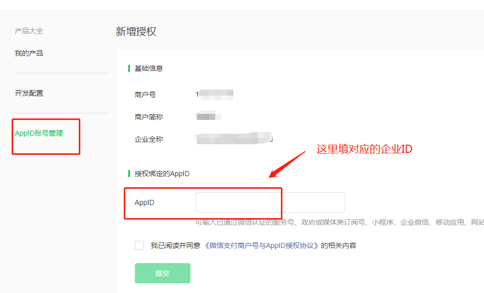 2.添加APPID,请注意填写的是企业微信的企业ID(即Corpid),用哪个企业发红包,就填写哪个企业的信息,与企微设置里面的企业ID一致即可