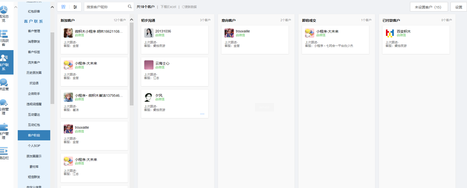 1.客户阶段可分为,初步沟通,了解中,有意向,即将成交等4个部分,可在后台自由设置,设置完成之后给客户分别打上对应的管理阶段(注:如果要需要某一时间段自动提醒员工继续跟进客户需要开通会话存档才能使用,如若不使用自动提醒跟进则不用开通会话存档)