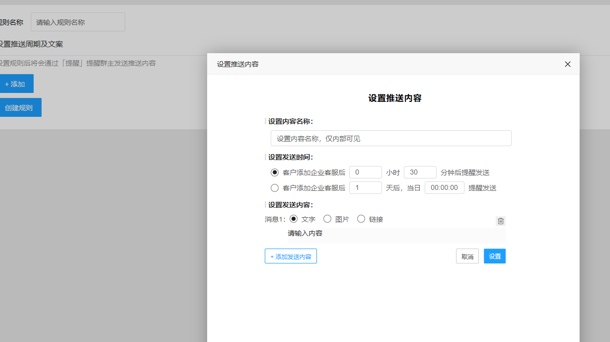 例如扫码添加客服后,设置好对应时间 则到该时间会有消息发送提醒员工去跟进刚刚添加进来的客户对产品进行讲解