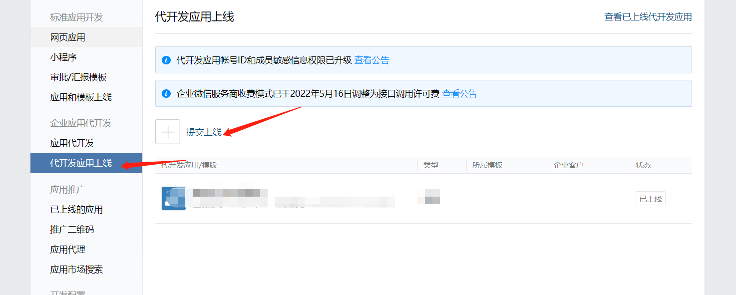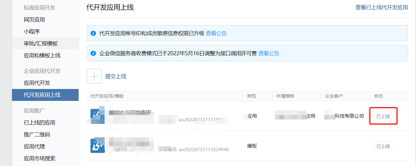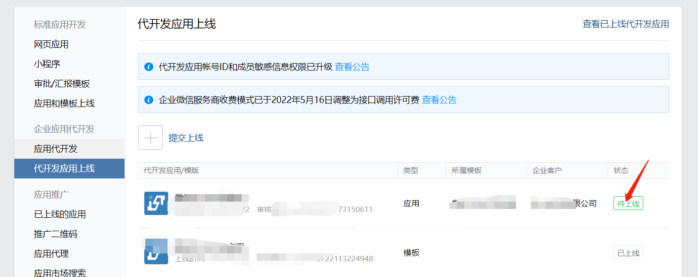 1..找到代开应用上线=》点击提交上线=》选择上线代开发应用=》勾选对应需要上线的客户企业点击确定