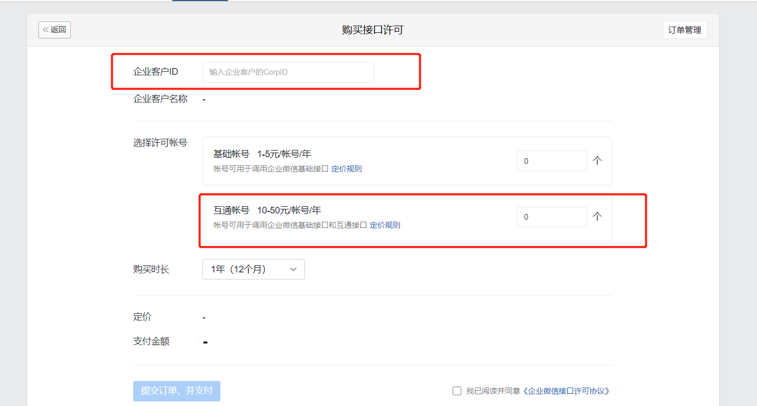 选择需要购买的数量(选择互通账户)提交订单支付,注意:需要几个人使用就购买几个