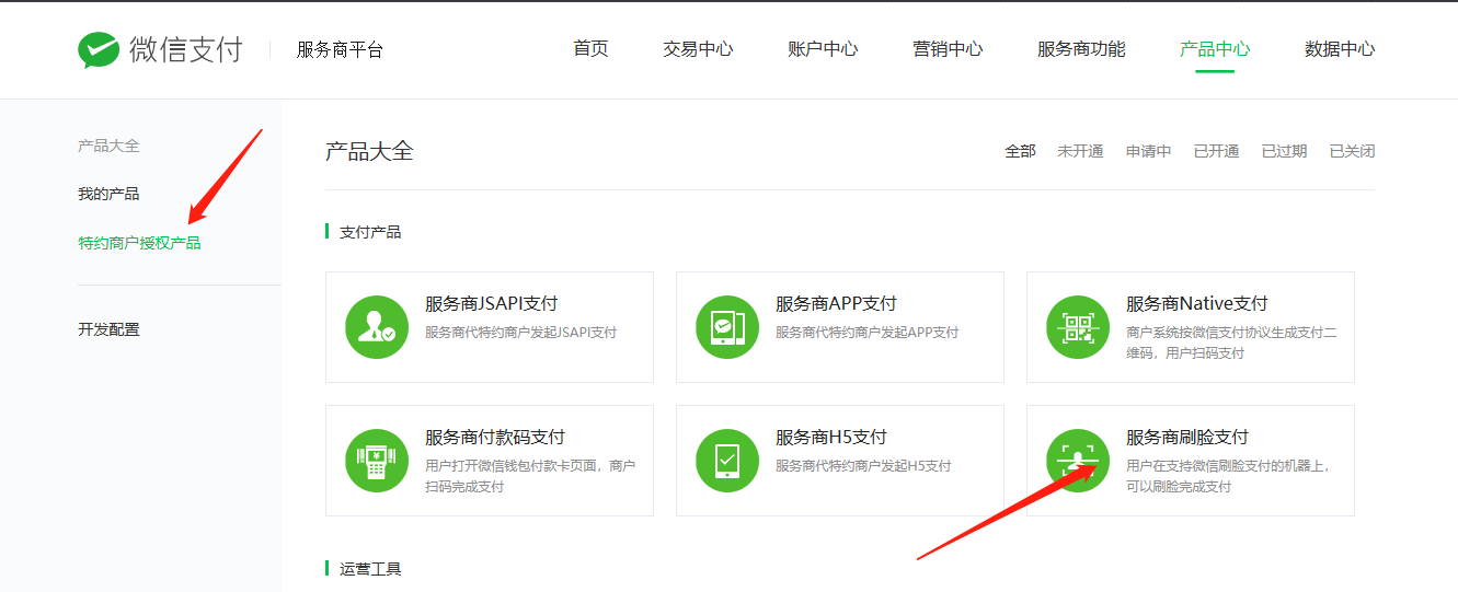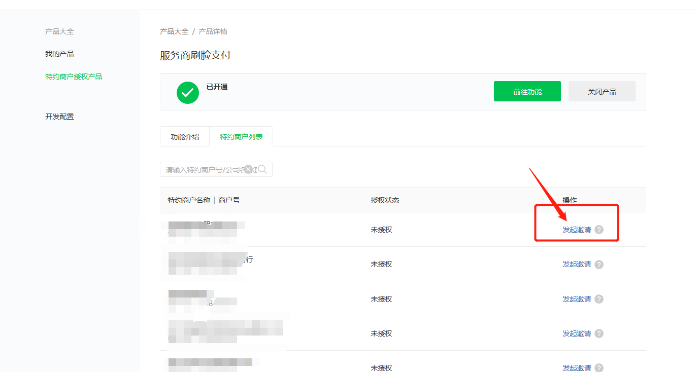 使用刷脸支付需要邀请商家的商户平台授权服务商刷脸支付,操作方法:服务商后台,产品中心-----特约商户授权产品------服务商刷脸支付,选择商家发起邀请