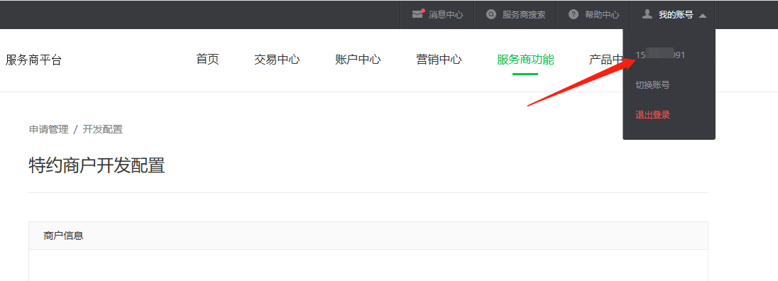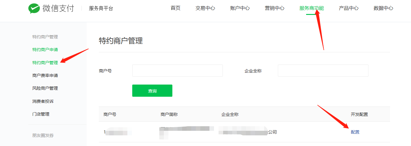 2.特约商户创建成功后,商户会在手机收到一条短信,然后根据短信提示入驻商户平台,入驻的时候需要查询下银行卡有一笔小额打款,然后服务商登录微信商户平台,点击服务商功能,特约商户管理,配置