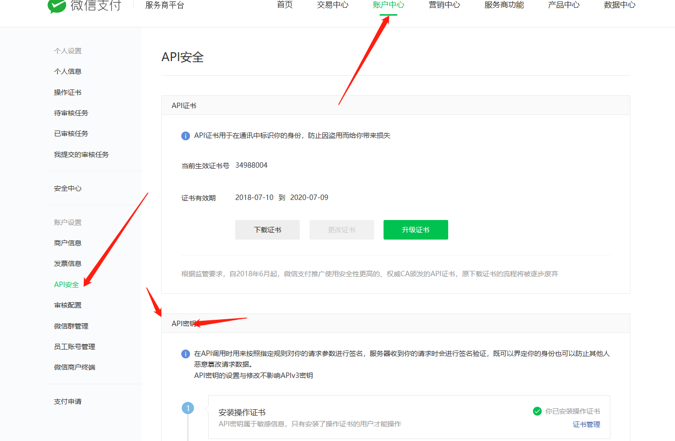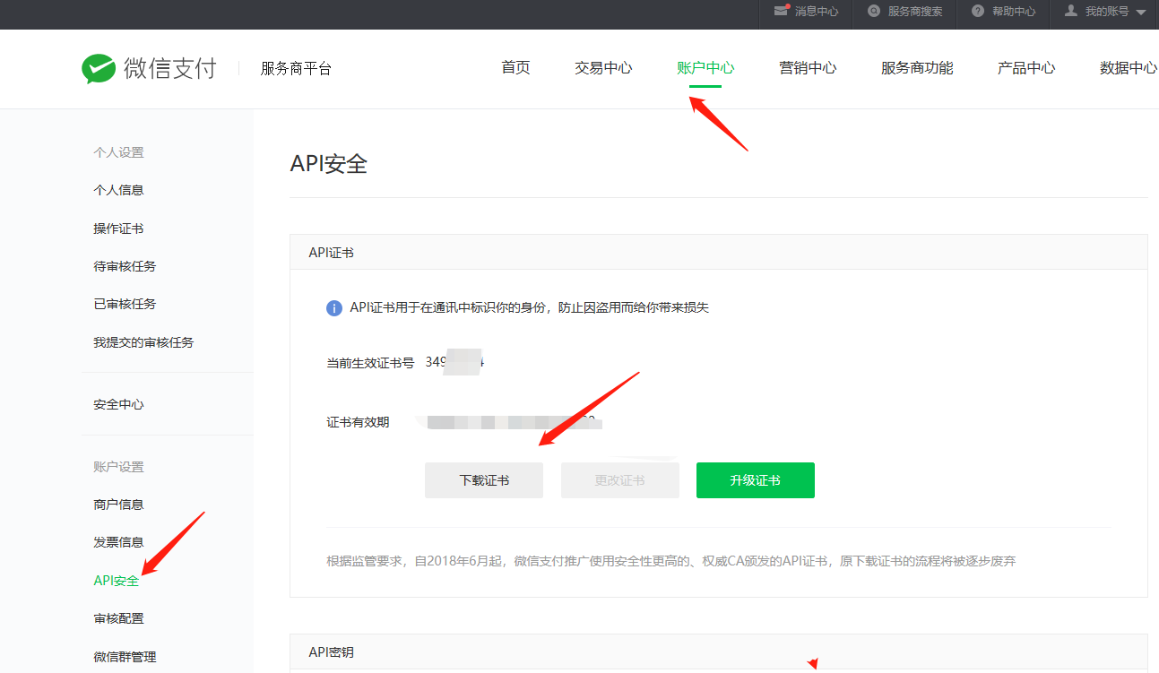 6.服务商商户平台产品中心,api安全下载证书,没用证书的话就先生成