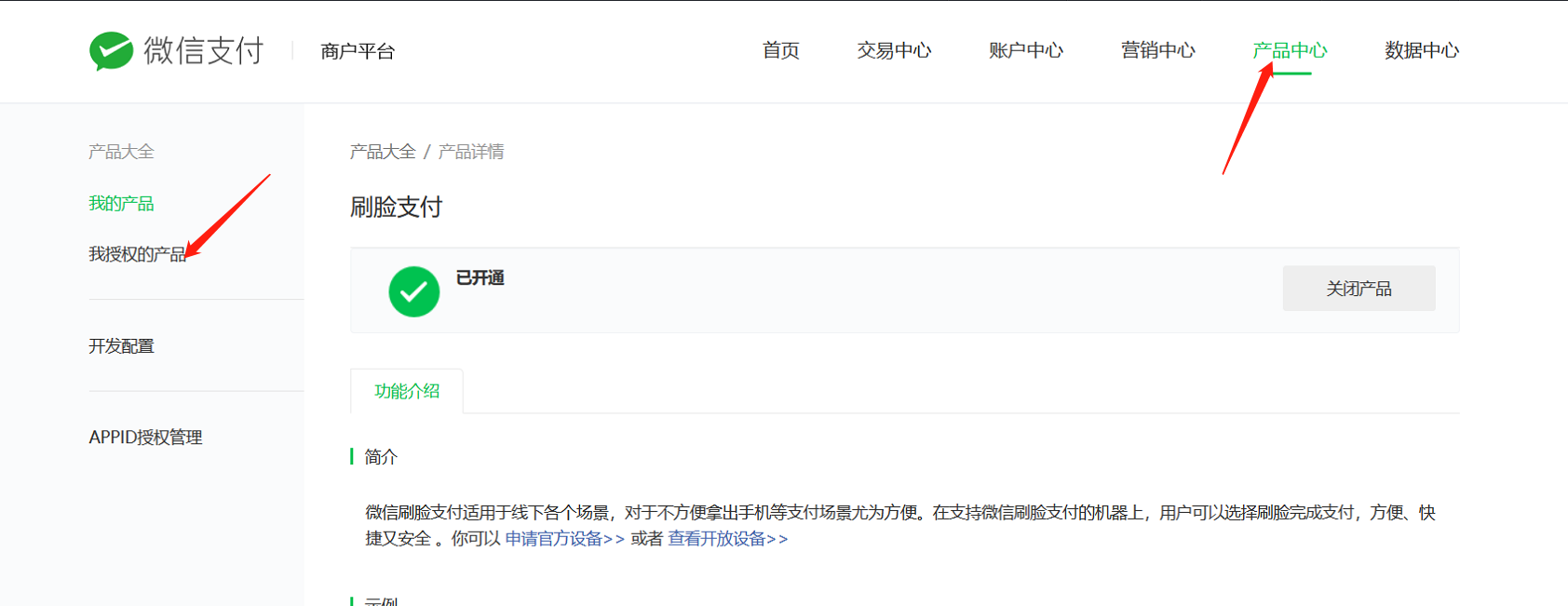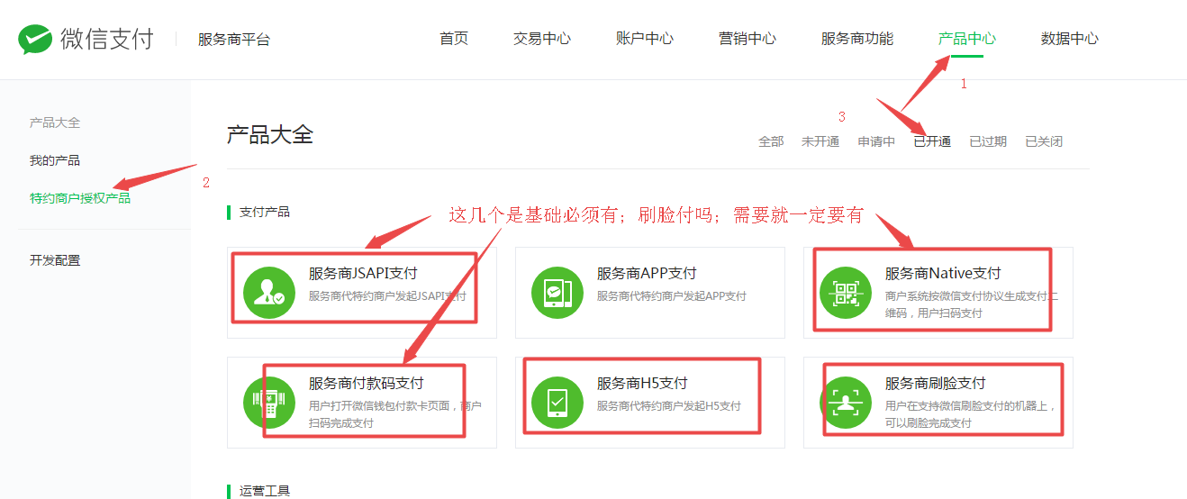 ## (一).产品中心,特约商户授权产品开通以下5个功能