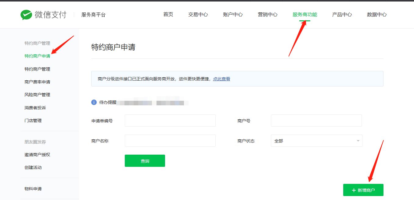 1。登录微信商户平台点击服务商功能,特约商户申请,新增商户