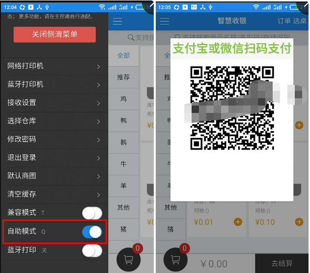 ## 九、自助模式 使用自助模式下单的时候,可以出现支付聚合码,让客户扫码支付  新版可以将聚合码推送到微信扫码设备让客户扫码付款