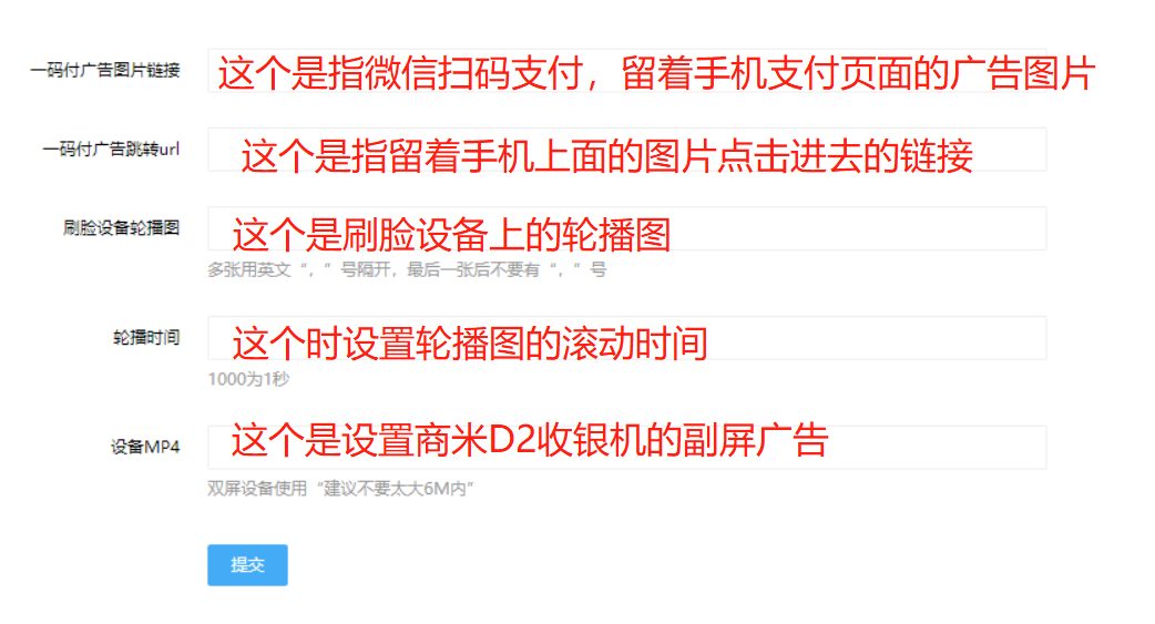 将刚刚复制的刚刚图片链接填入刷脸设备轮播图里面,如果有多图每个图以英文状态的逗号隔开,然后设置轮播滚动的时间,一码付广告图片链接也可以用刚刚的方式复制过来,一码付广告跳转url直接输入需要做广告人公司的网址即可