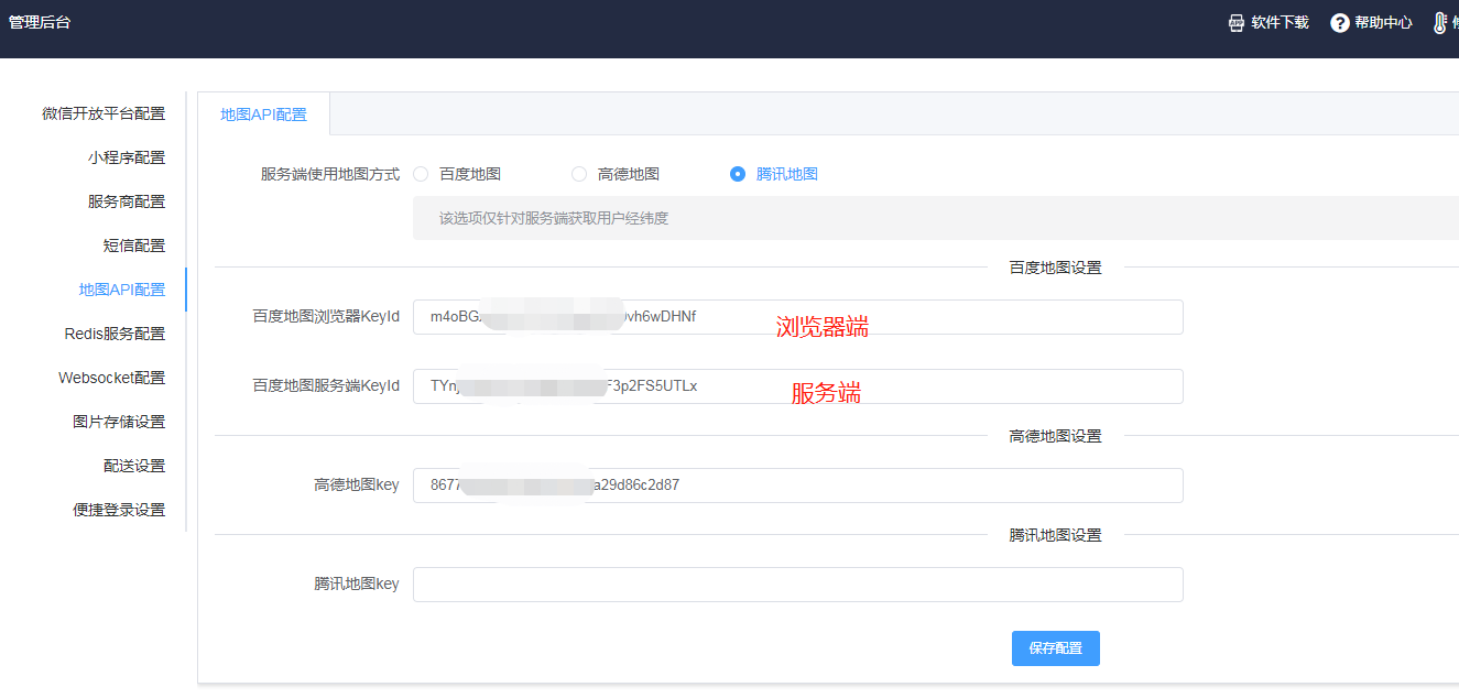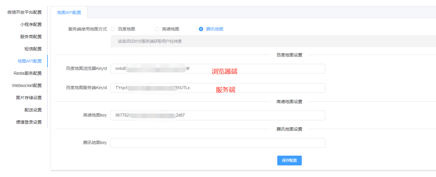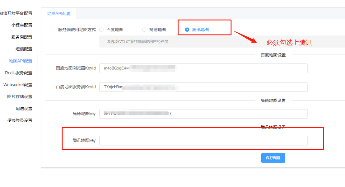 (2)合作伙伴需要配置百度地图和腾讯地图(高德可以不用配置),百度地图的参数必须配置,后台勾选腾讯地图