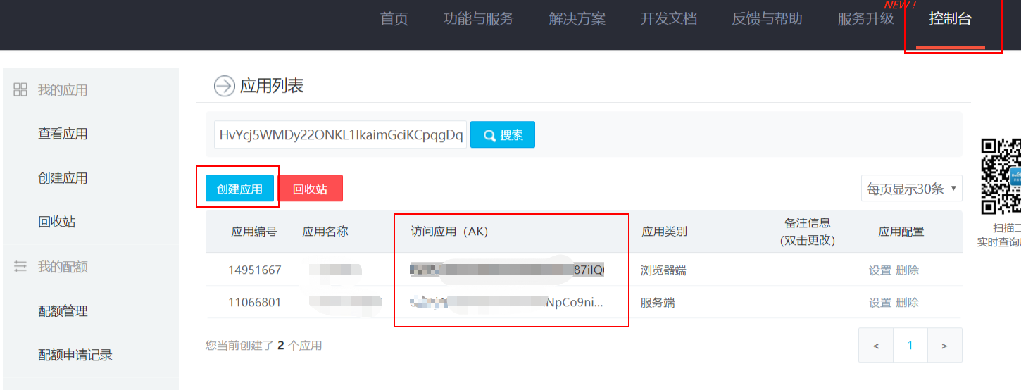 进入百度地图下的控制台,去分别获取这两个参数并配置