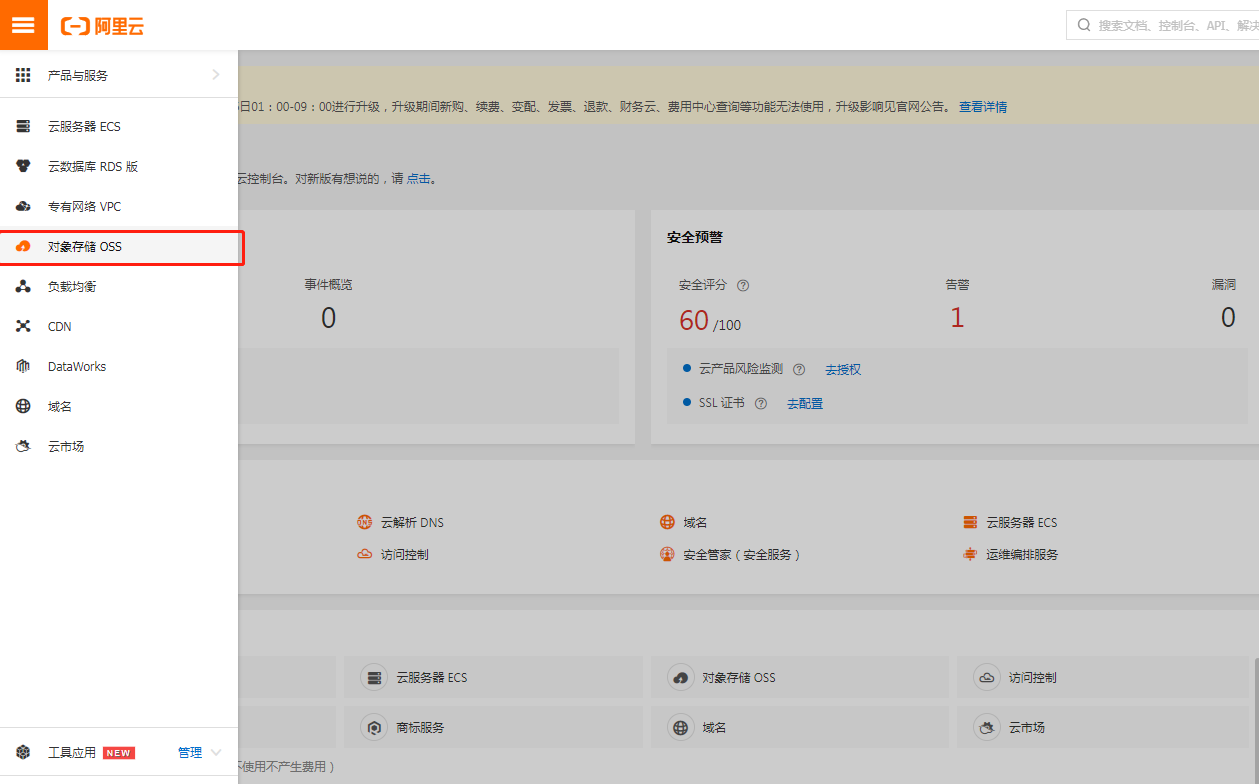 1、登录阿里云,进入控制台,找到对象存储