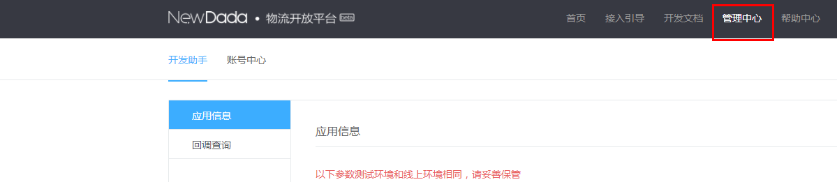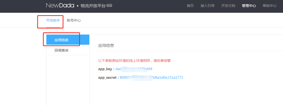 3、点击开发助手,点击应用中心,记录app\_key和app\_secret