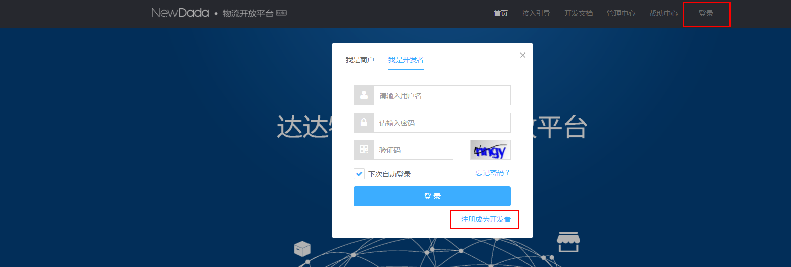 1、[登录达达开发者平台newopen.imdada.cn](http://xn--newopen-hk3l5i347gjlbe3ac51t551a6j3ca.imdada.cn/),注册开发者账号