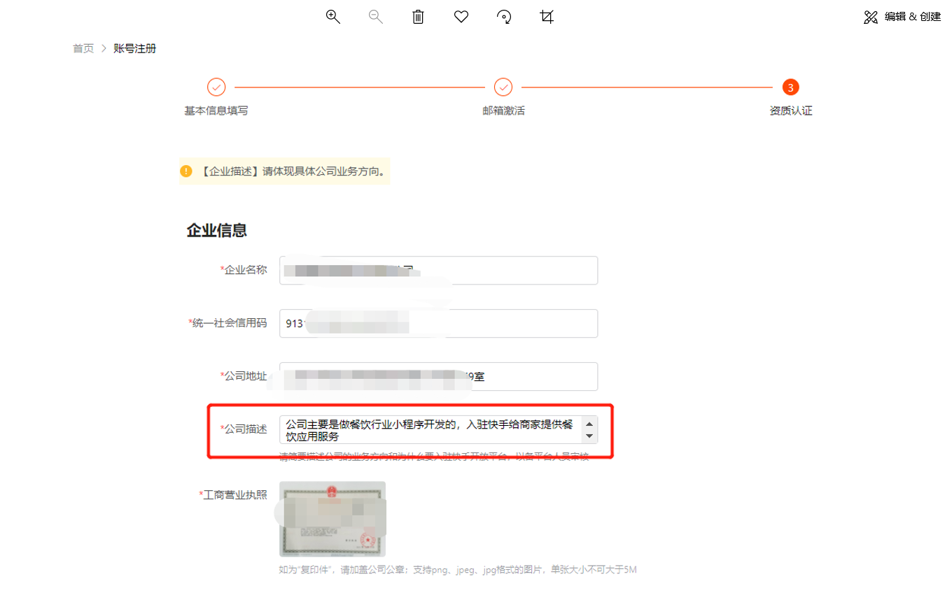 `先注册账号,填写自己的公司营业执照资料,完成实名认证
