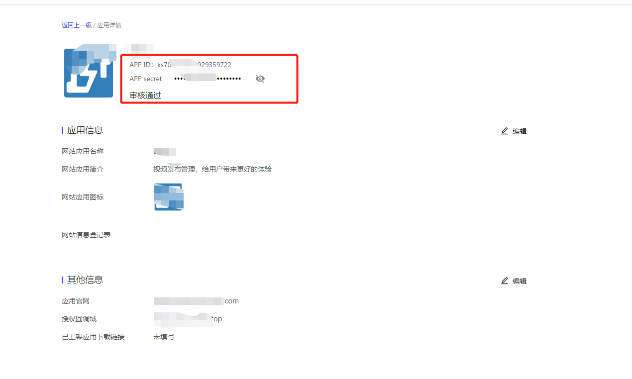 审核通过之后,点击名称进入详情页,复制APP ID、APP secret到后台