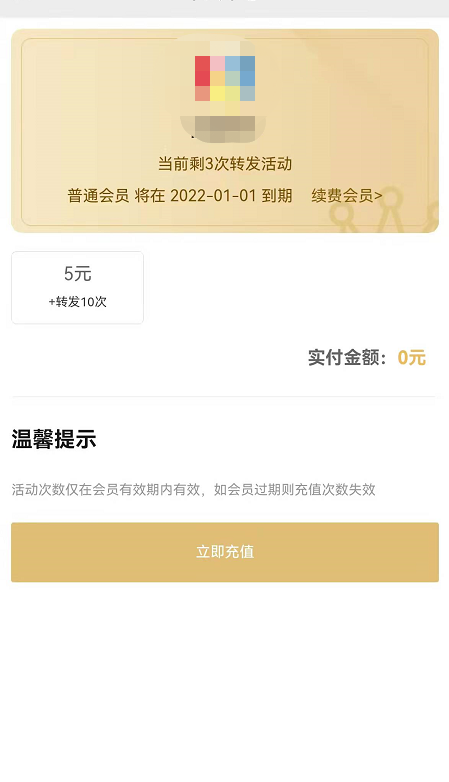 用户成为商家后买会员后,默认会有会员限制发布卡券活动的次数限制,次数到达后,会员没有到期。可以选择单独购买会员发布卡券次数。**(修改也算活动次数)充值的活动次数在会员有效期内使用,会员到期,次数就会失效**