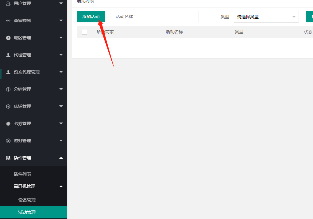 点击添加活动,选择商家,这个活动就给某个商家使用。然后输入活动的名称奖品以及活动时间,用户抽奖的次数。然后选择设备,一个活动只能使用一个设备,多个活动只能不能同时使用一个设备,只有在一个活动时间结束后才能,再使用同一个设备