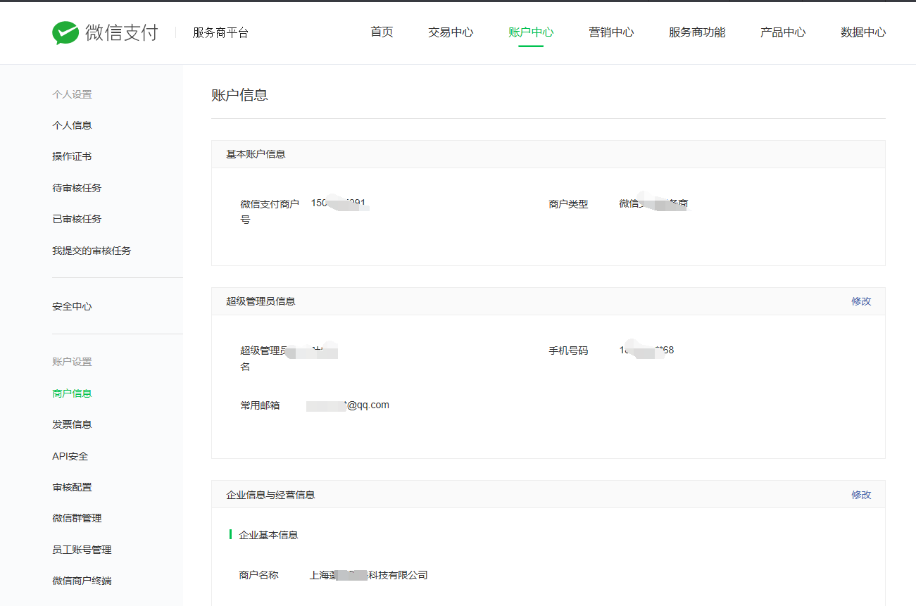 \[2\] 点击账号中心下商户信息页面中即可获取到服务商的商户信息