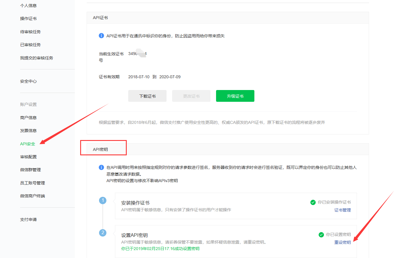 \[3\] 进入账号中心下Api安全页面中即可申请获得服务商商户所需的商户秘钥信息,设置API密钥,密钥为32位