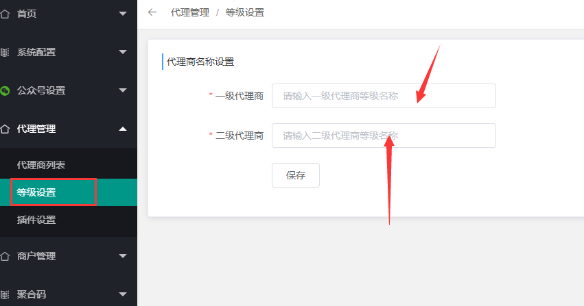 代理商等级这里可以给自己的一级和二级代理设置不同的名字来区分