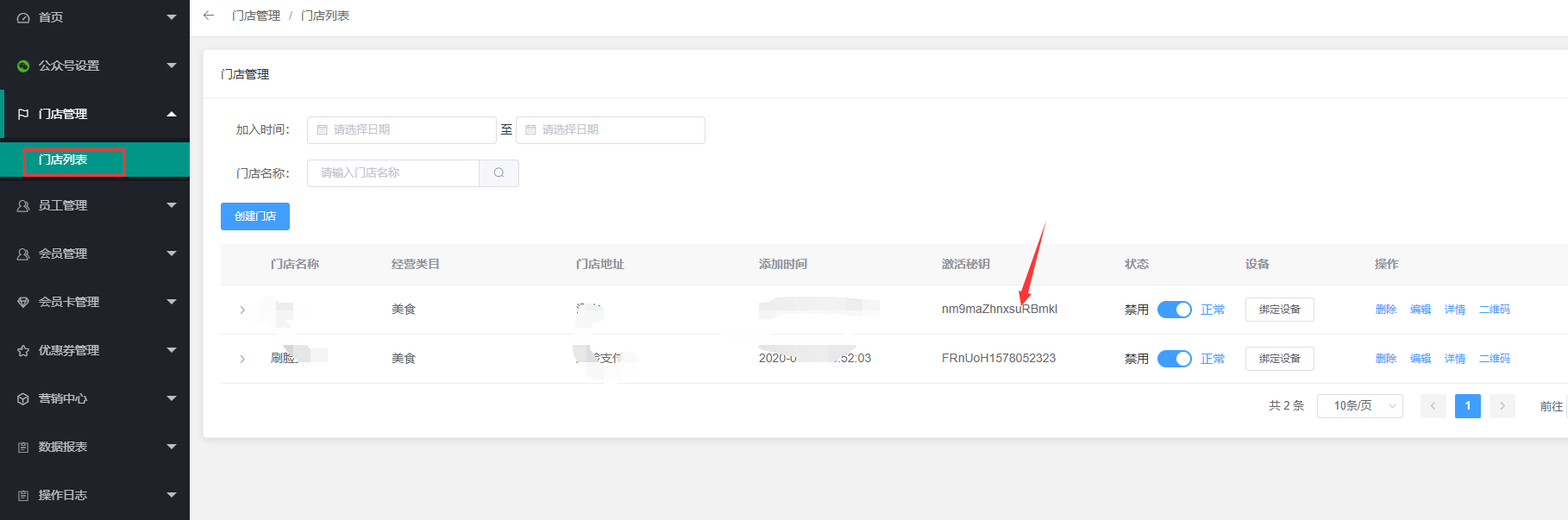 #### 一、登录商家后台,门店管理,门店列表,点击绑定设备,进行绑定音箱ID
