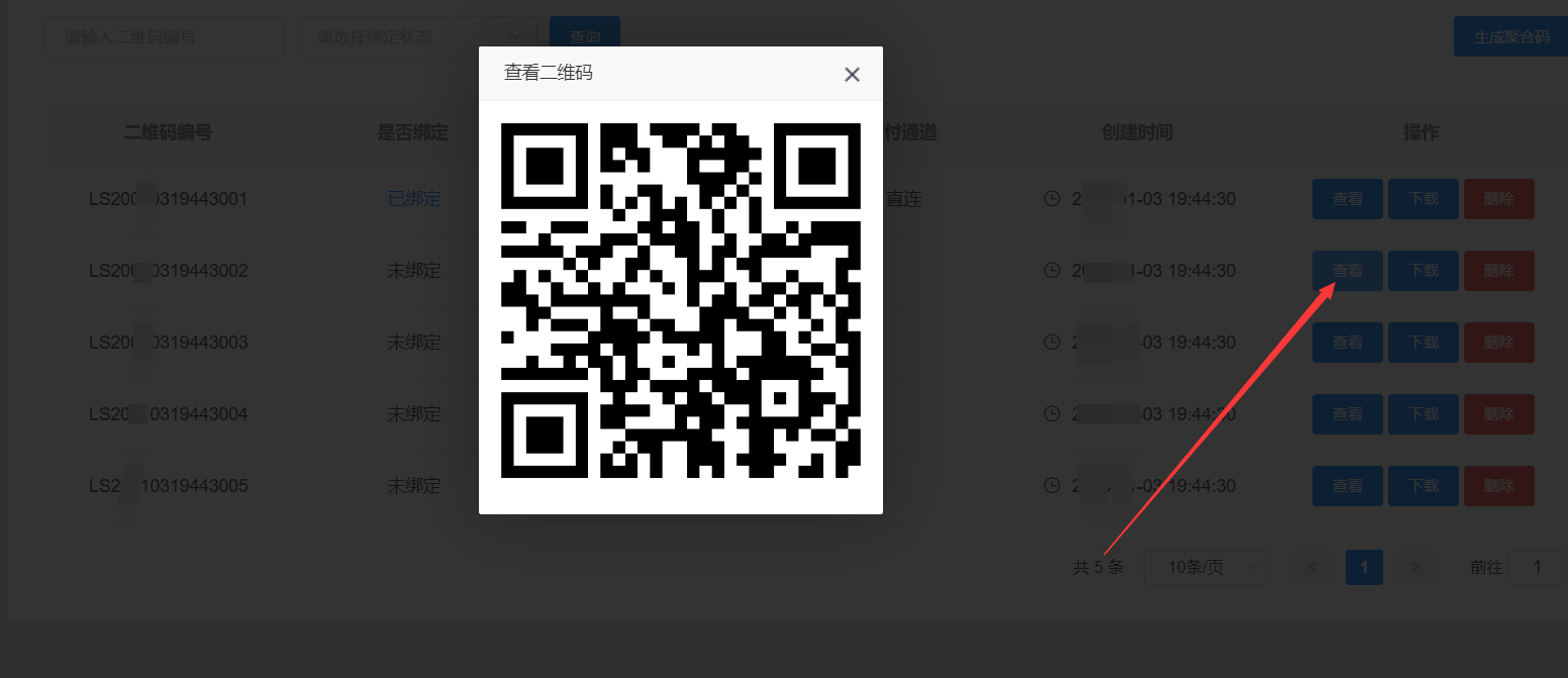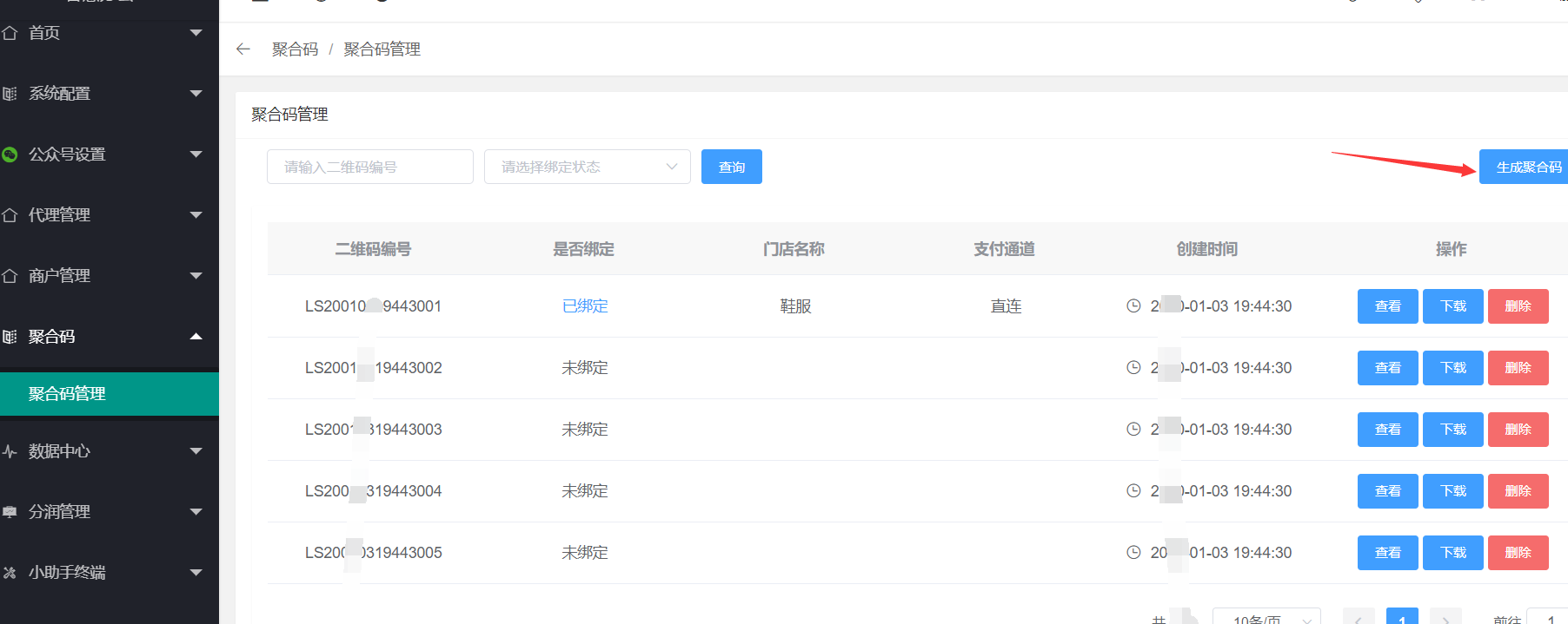 1、点击生成聚合码,可以自定义生成一系列的空白的聚合码,用于商户扫码激活