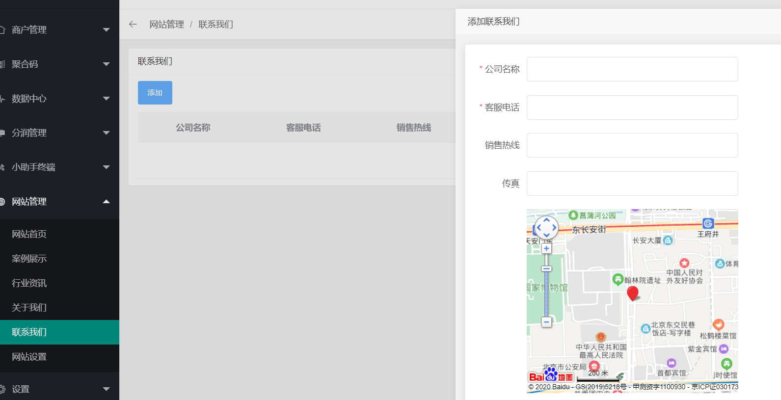 进入联系我们页面,点击添加,可设置网站首页的联系我们页面