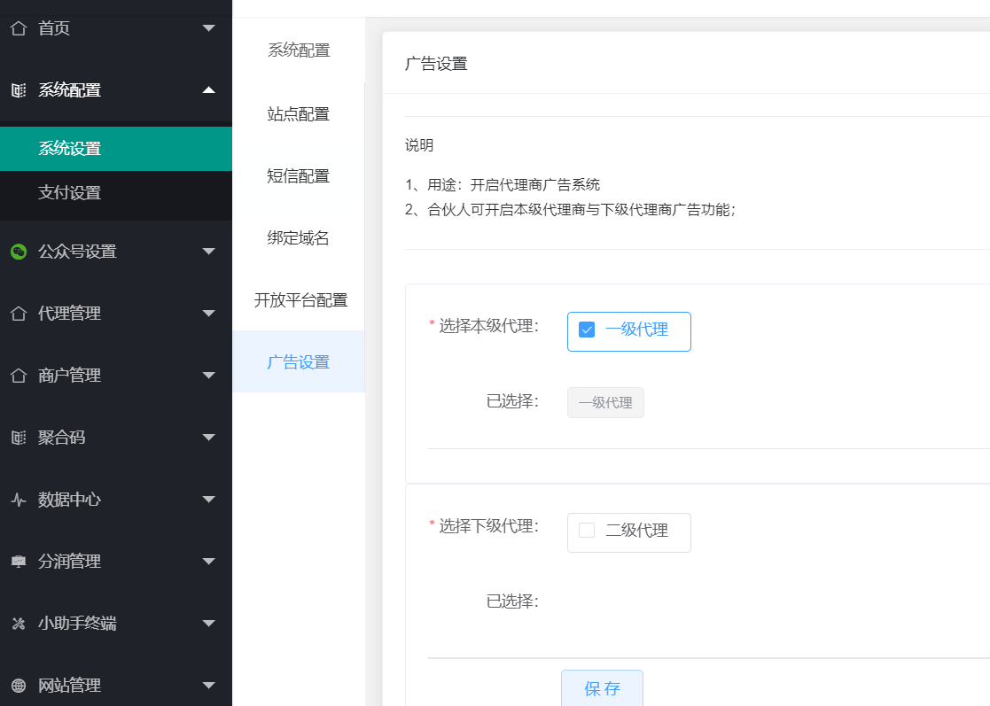 服务商后台中的广告主要用途:开启代理商广告系统(服务商可开启本级代理商与下级代理商广告功能)
