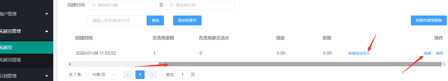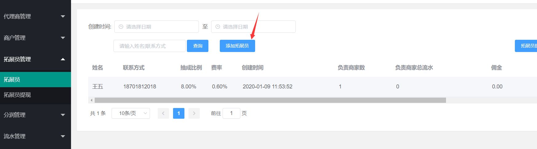 1、进入拓展员页面,点击添加拓展员(拓展员的功能是用于添加商户和进件)