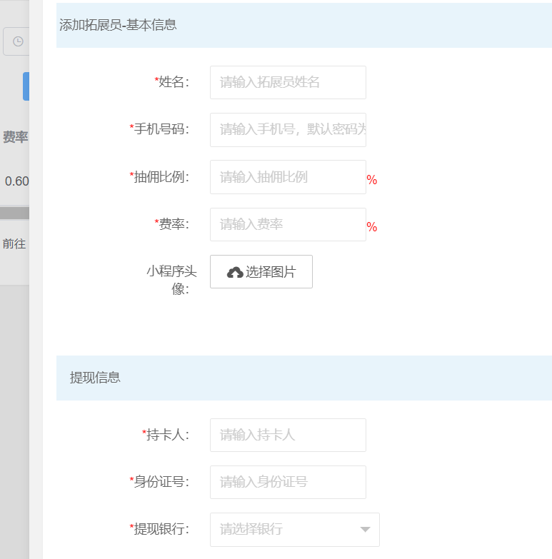 * \[2\]费率:费率就是代理商给拓展员做的规定,推展员发展商户的时候给商户的费率最低不能低于多少,比如最低不能低于0.3,0.3就是填写30%