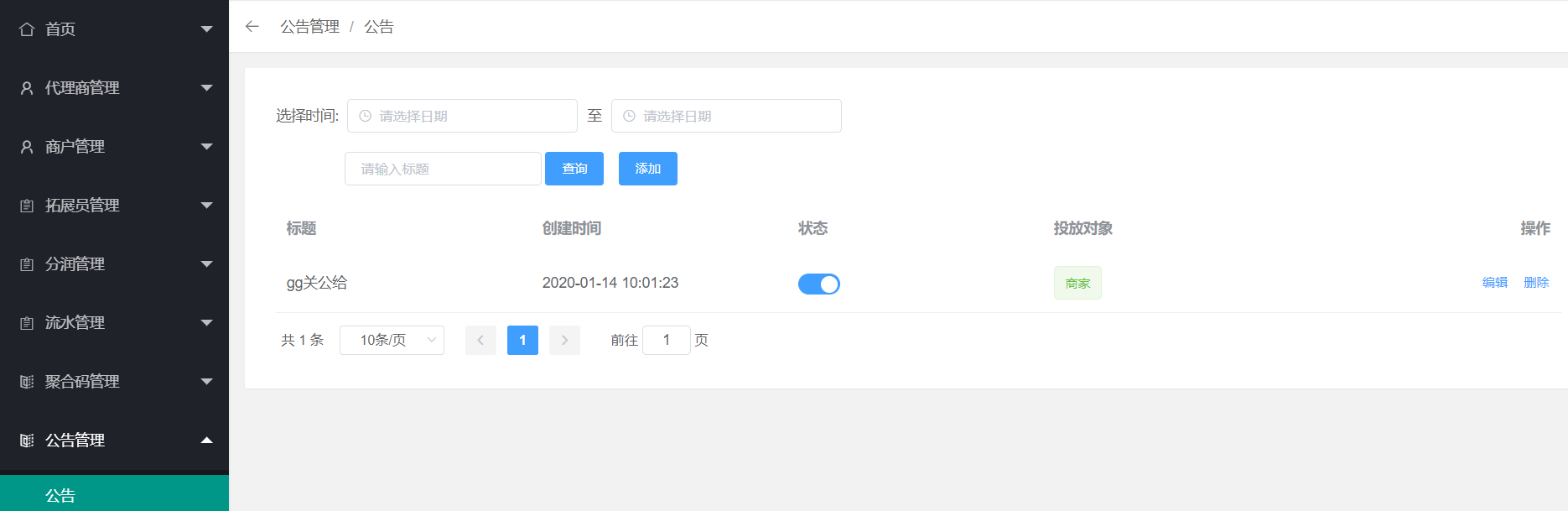 1、点击公告,可以添加在商户中可以轮播的公告信息