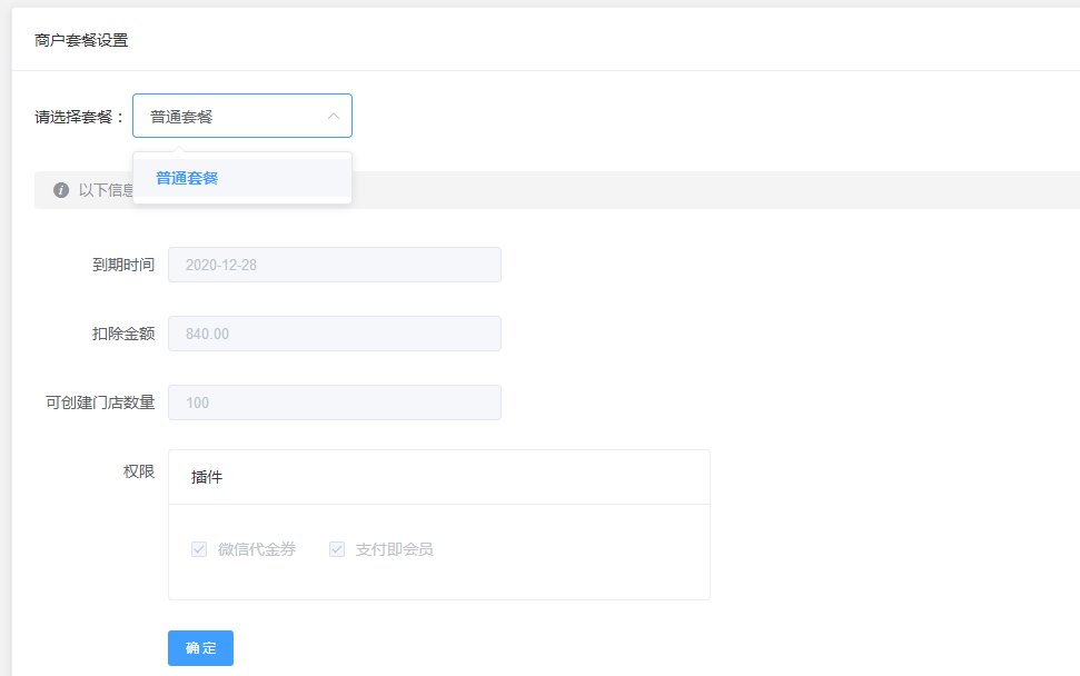 确定后将从代理商余额中扣除套餐成本价(当代理商账户余额小于套餐成本价,则无法套餐无法设置成功)