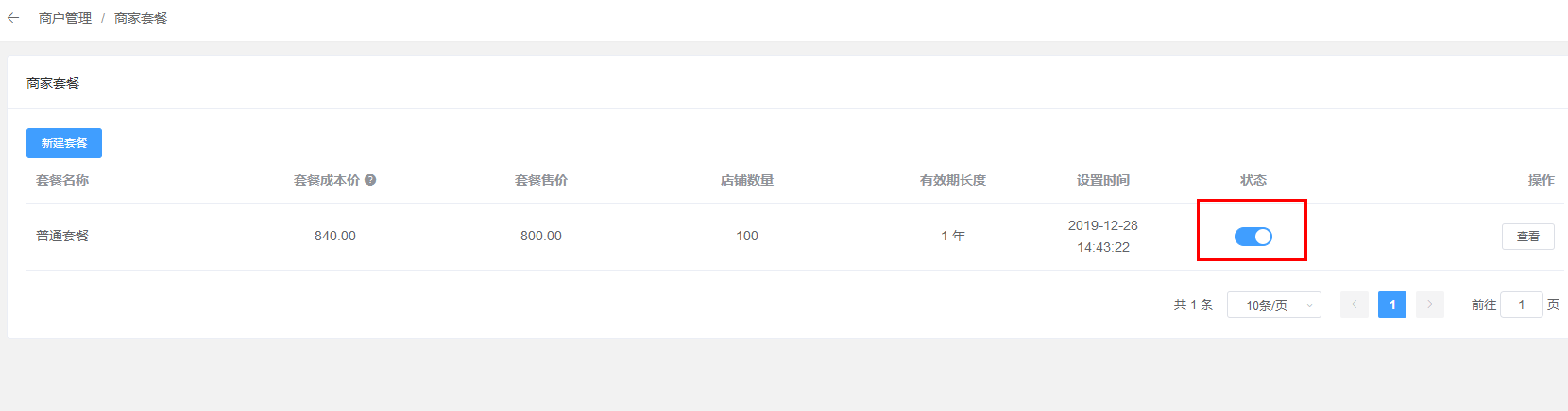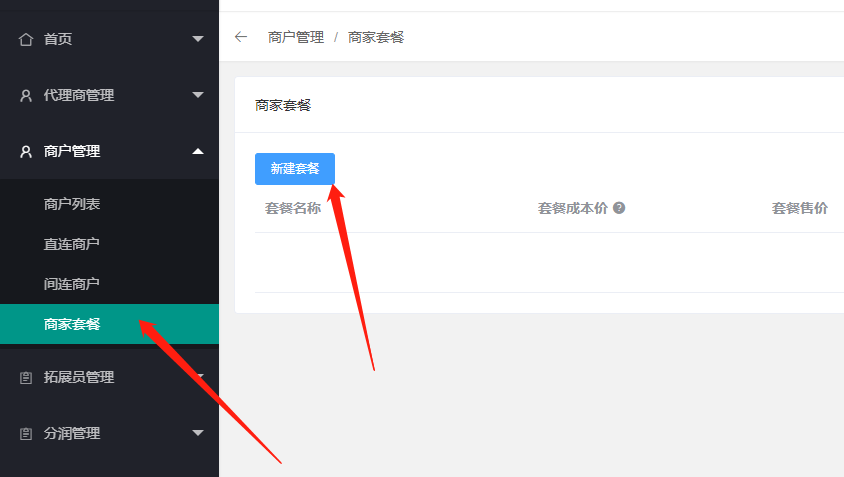 1、进入代理商的后台设置商家套餐(默认为禁用状态):点击商户管理--商家套餐\--新建套餐