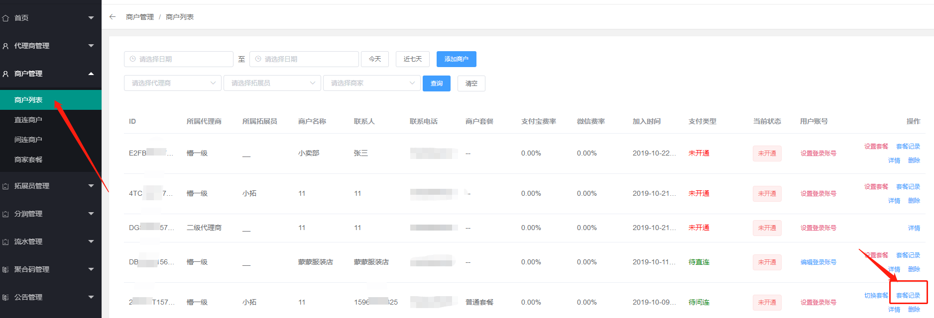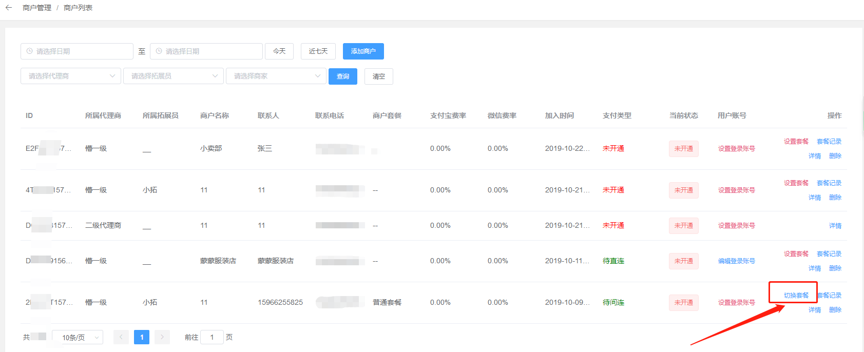 3、给商家切换套餐:点击商户列表--切换套餐\--切换新套餐\--切换成功